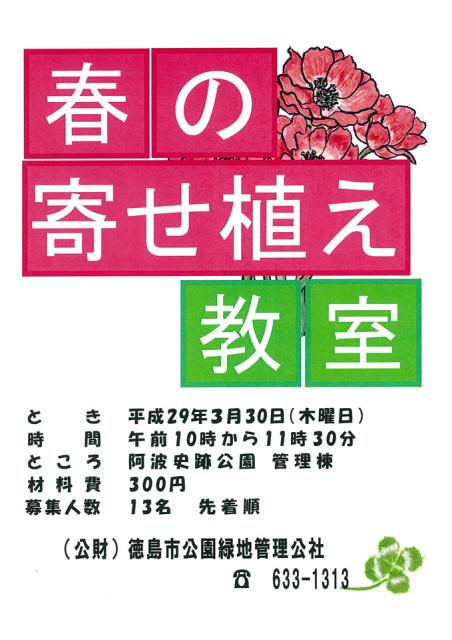 HOME お知らせ 春の寄せ植え教室 春の寄せ植え教室 2017/03/03 春の花々を寄せ植え教室を開催いたします。先着順になっております。たくさんの皆さまのご応募をお待ちしております。 BACK HOME