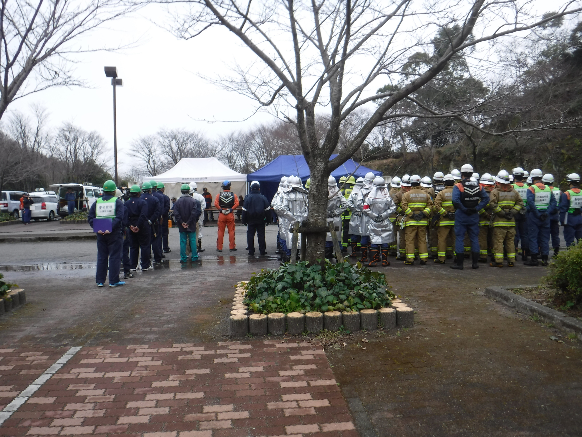 眉山公園林間駐車場付近で出火し、公社職員が発見、119番通報と公社への通報、初期消火及び避難誘導をしたが、延焼が拡大したという想定で消火訓練が行われました。