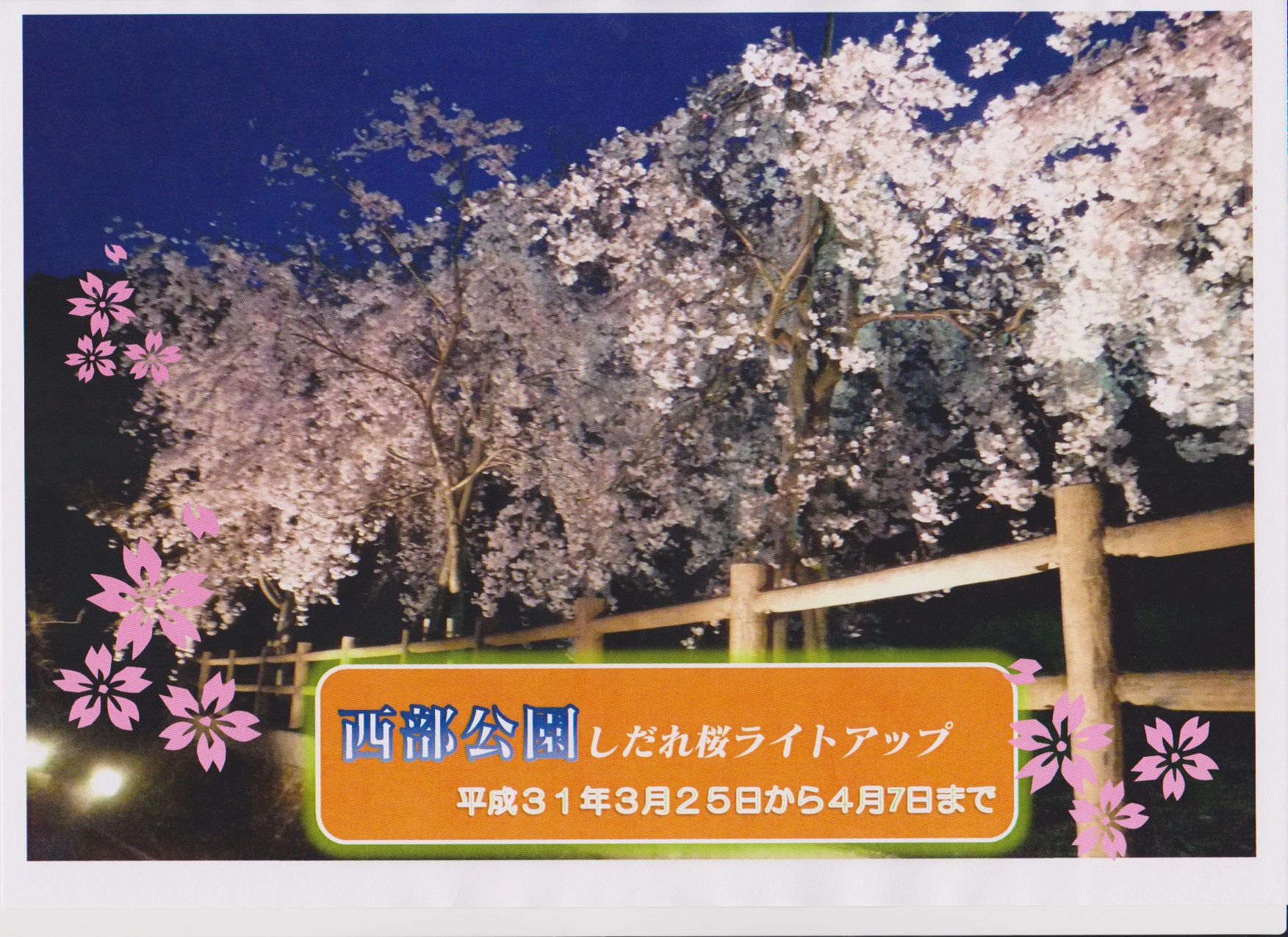 HOME お知らせ 西部公園ライトアップ 西部公園ライトアップ 2019/03/05 西部公園のしだれ桜をライトアップします。期間は、3月25日(月)から4月7日(日)です。時間は、日没から23時まです。 BACK HOME