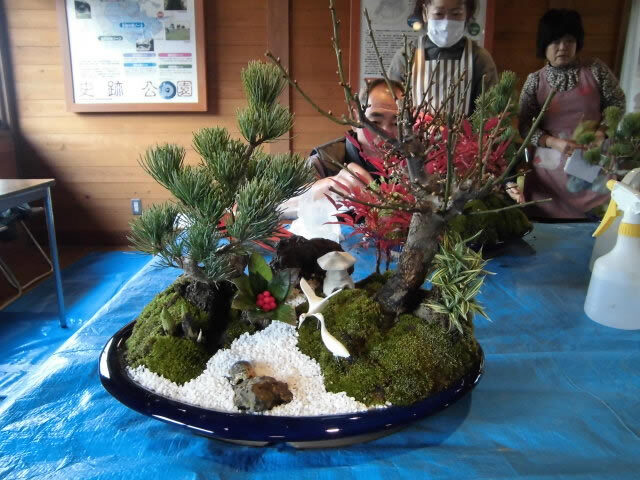 また他に、福寿草、ナンテン、ヤブコウジ、苔、石などを使用します。