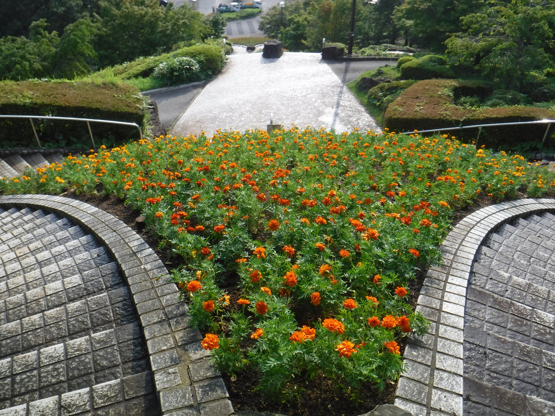 今夏も、徳島市の夏の風物詩として日本に誇る阿波おどりの季節が近付いて来ました。阿波おどりの開催に合わせ、たくさんの観光客に見て頂きたく、眉山公園の斜面花壇に花を植え替えました。花の種類は、マリーゴールドのオレンジ色と黄色合わせて1640本植栽しています。