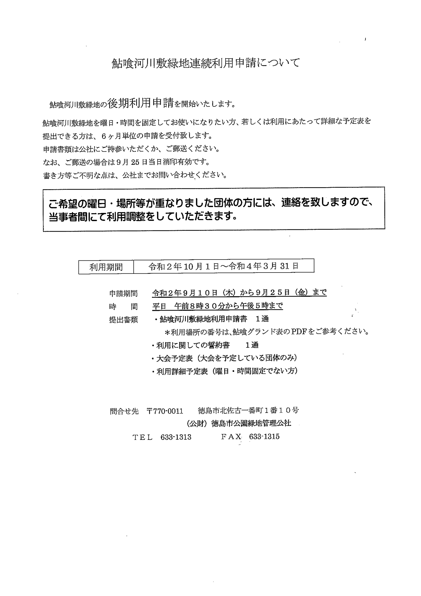 鮎喰河川敷利用申請の後期分の受付を開始致します。