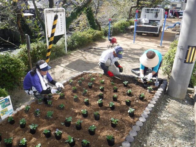 色彩あふれる紅葉の美しさに心弾む季節となり、鮎喰町2丁目の袋井公園南側で「袋井公園を美しくする会」の皆様とともにパンジー120本の花を植栽しました。パンジーは秋から春まで長期間咲く品種が多く、殺風景になりがちな冬のガーデンになくてはならない存在となっています。