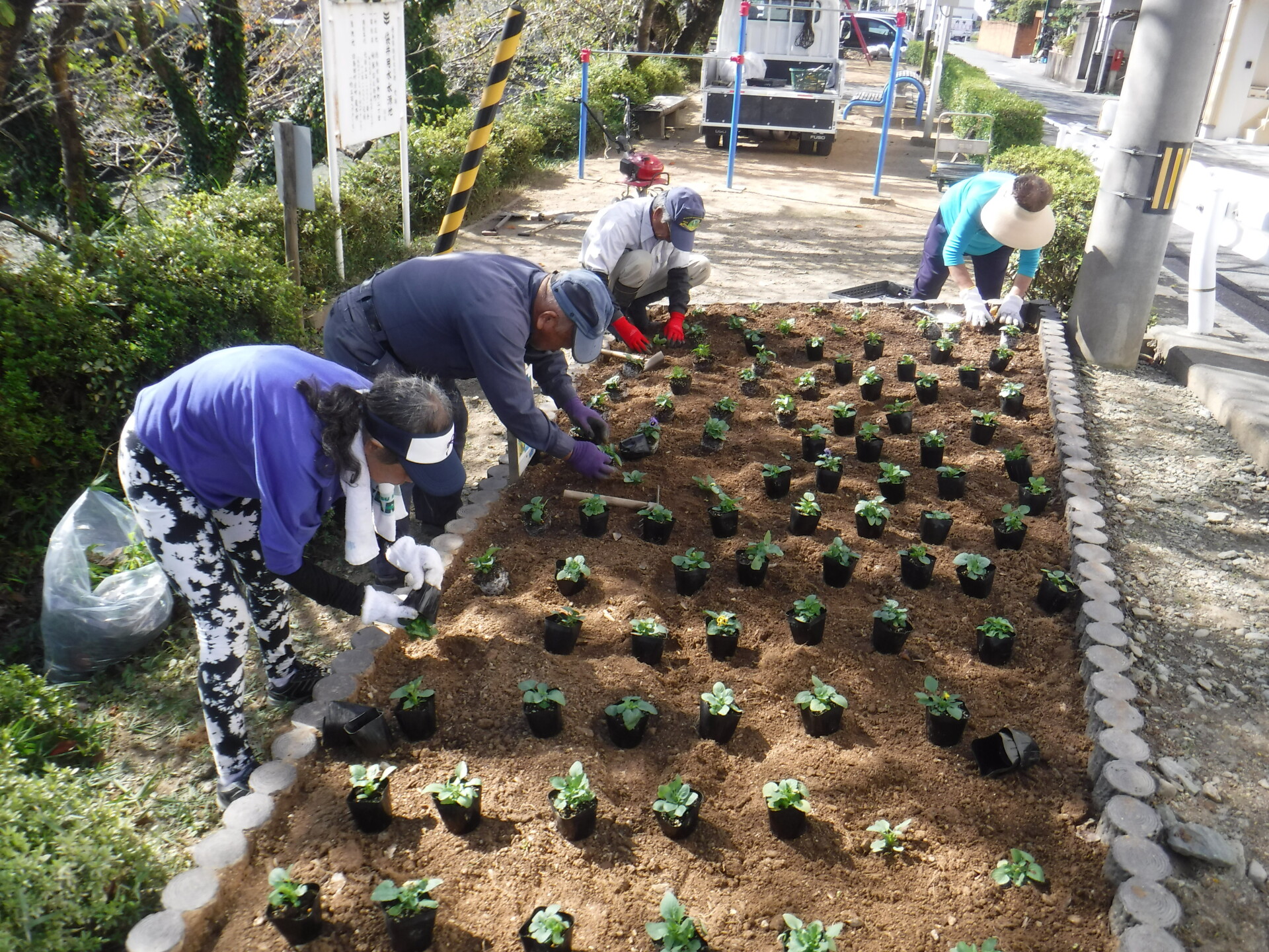 袋井公園の花をパンジーに植え替えました。