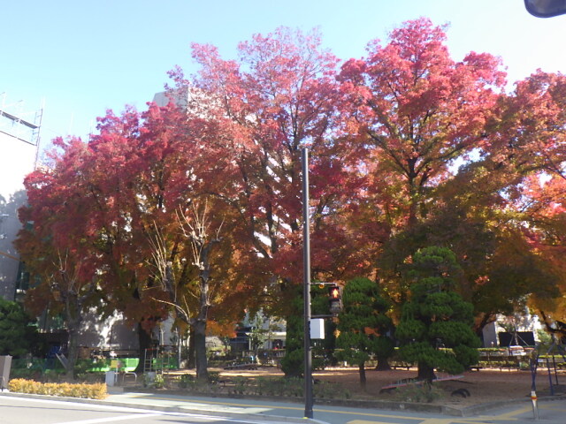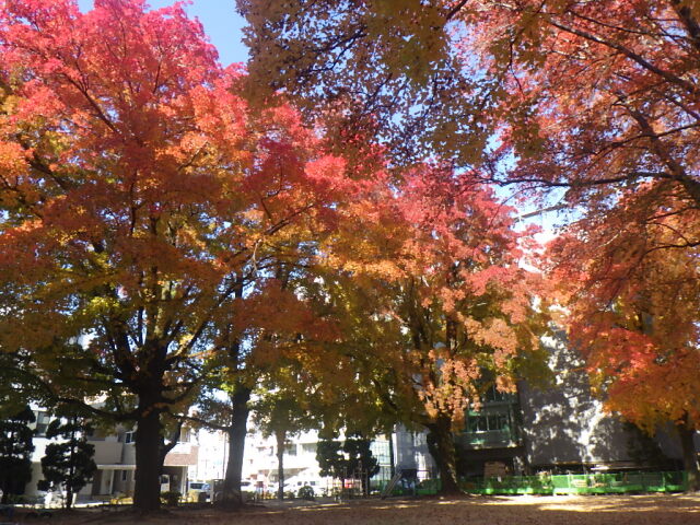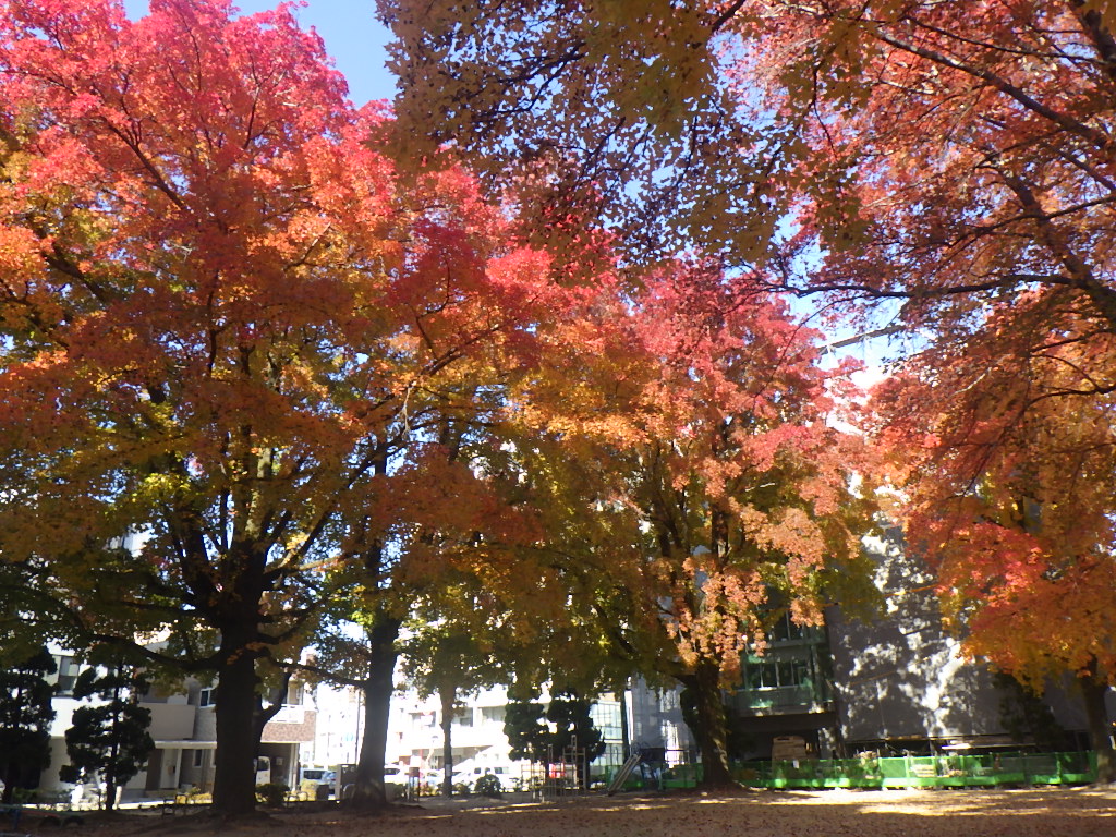 街は色とりどりのイルミネーションがきらめき、クリスマス一色に染まっています。クリスマスのイルミネーションに負けないぐらい、徳島市の幸町公園では高さ約15メートルのタイワンフウが赤と黄色の鮮やかなグラデーションに色づき、落ち葉とともに公園全体を覆っているようで師走の街に彩りを添えています。