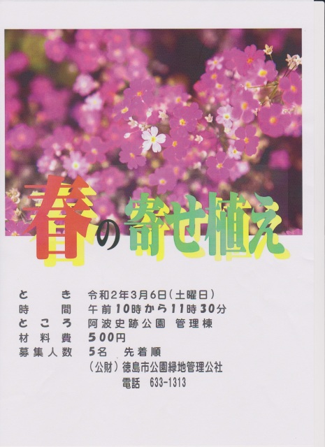 HOME お知らせ 春の寄せ植え 春の寄せ植え 2021/02/15 令和3年3月6日(土曜日)午前10時から阿波史跡公園にて、春の寄せ植え教室を開催します。ご応募をお待ちしています。 BACK HOME