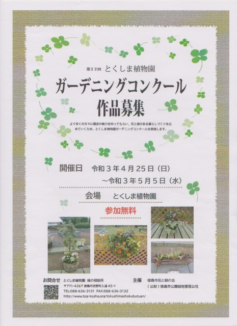 HOME お知らせ ガーデニングコンクール ガーデニングコンクール 2021/03/01 3月1日より、第22回とくしま植物園ガーデニングコンクールの作品を募集いたします。たくさんのご応募をお待ちしております。詳細は、とくしま植物園ホームペーズをご覧ください。 BACK HOME