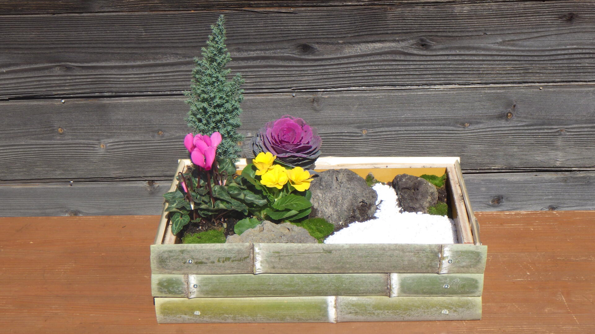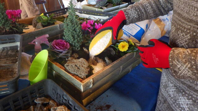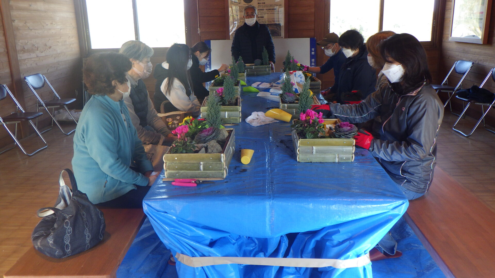 令和4年12月10日(土)阿波史跡公園管理棟にて、冬の園芸教室が開催されました。参加者の皆様には、竹鉢に、コニファー、ハボタン、ミニシクラメン、プリムラジュリアンの花を植えていただき、溶岩石を配置し苔を張り、最後に寒水砂を敷きならして完成となりました。