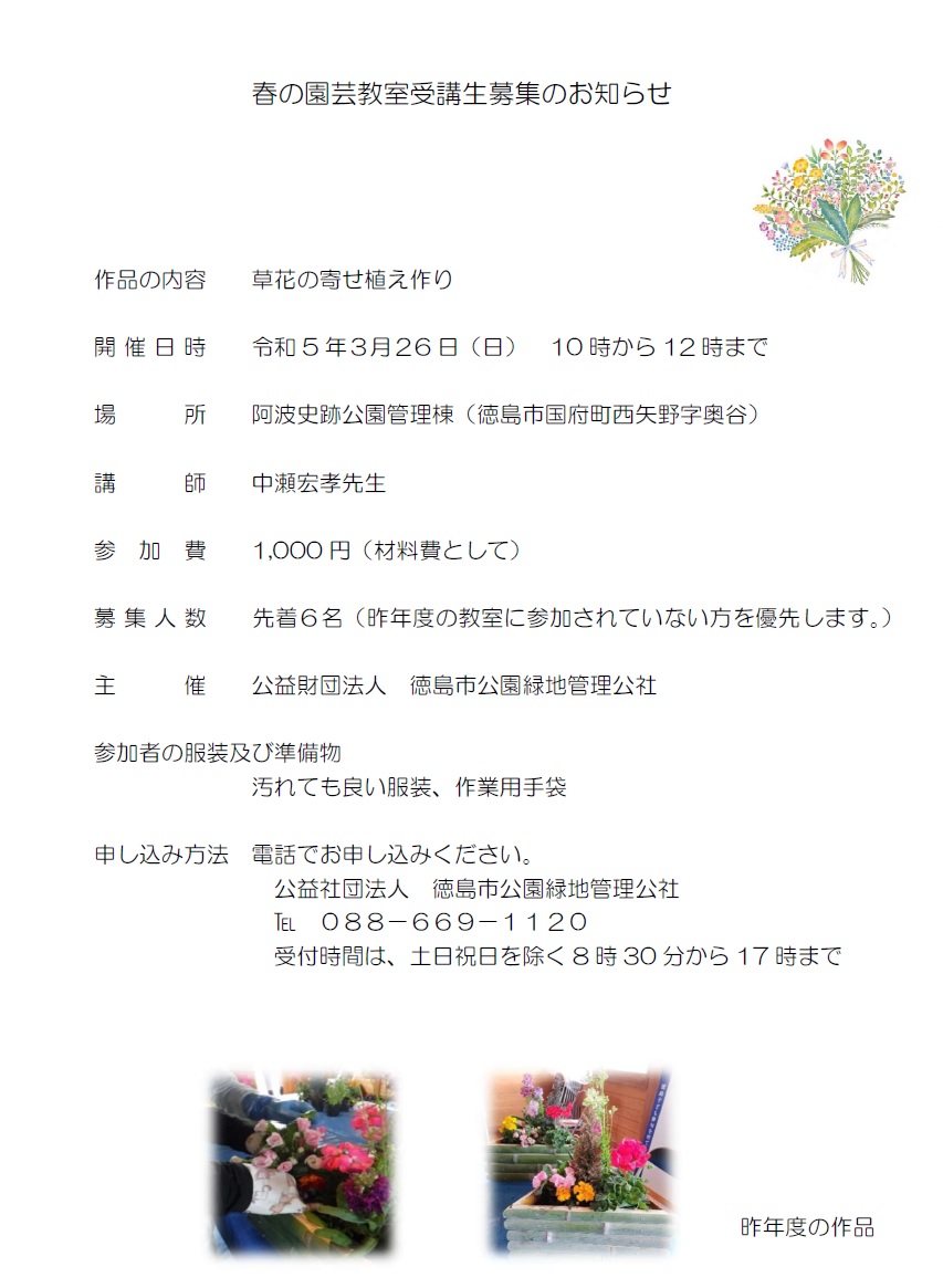 HOME お知らせ 春の園芸教室受講生募集のお知らせ 春の園芸教室受講生募集のお知らせ 2023/03/08 春から初夏にかけての草花で、寄せ植えをつくってみませんか?皆さまのご参加をお待ちしています。 BACK HOME