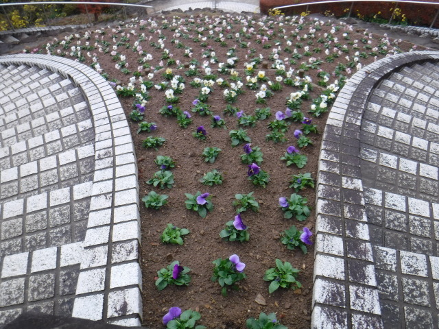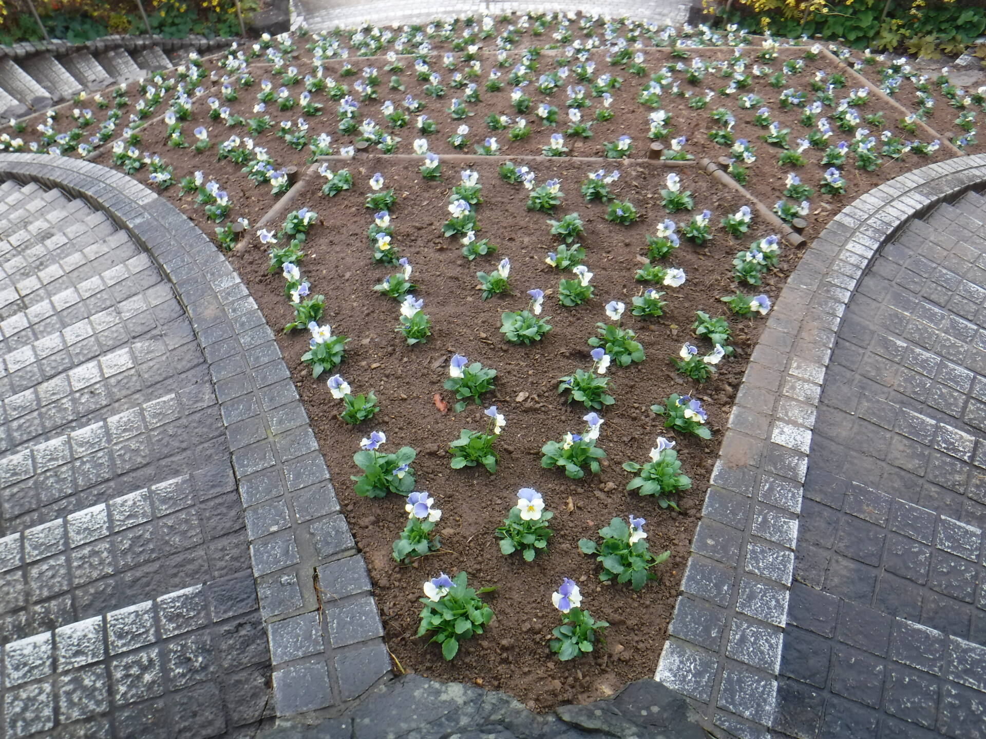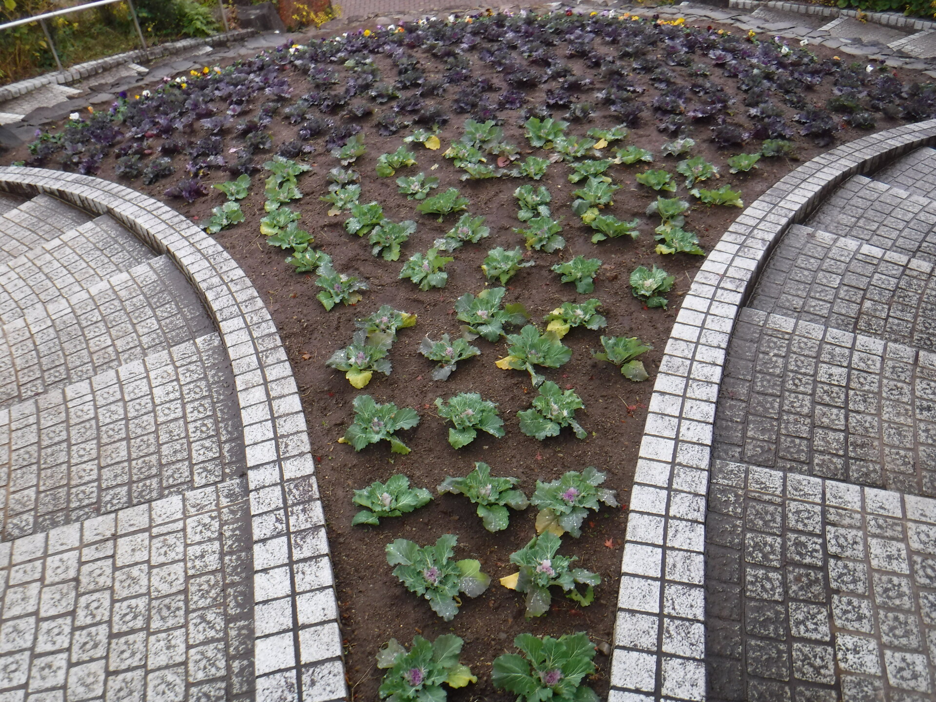 今年もとうとう残りひと月となりましたが、この度、眉山公園花のカスケードに紅白のハボタンとパンジーの花を植栽しました。