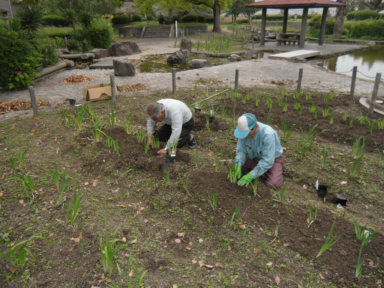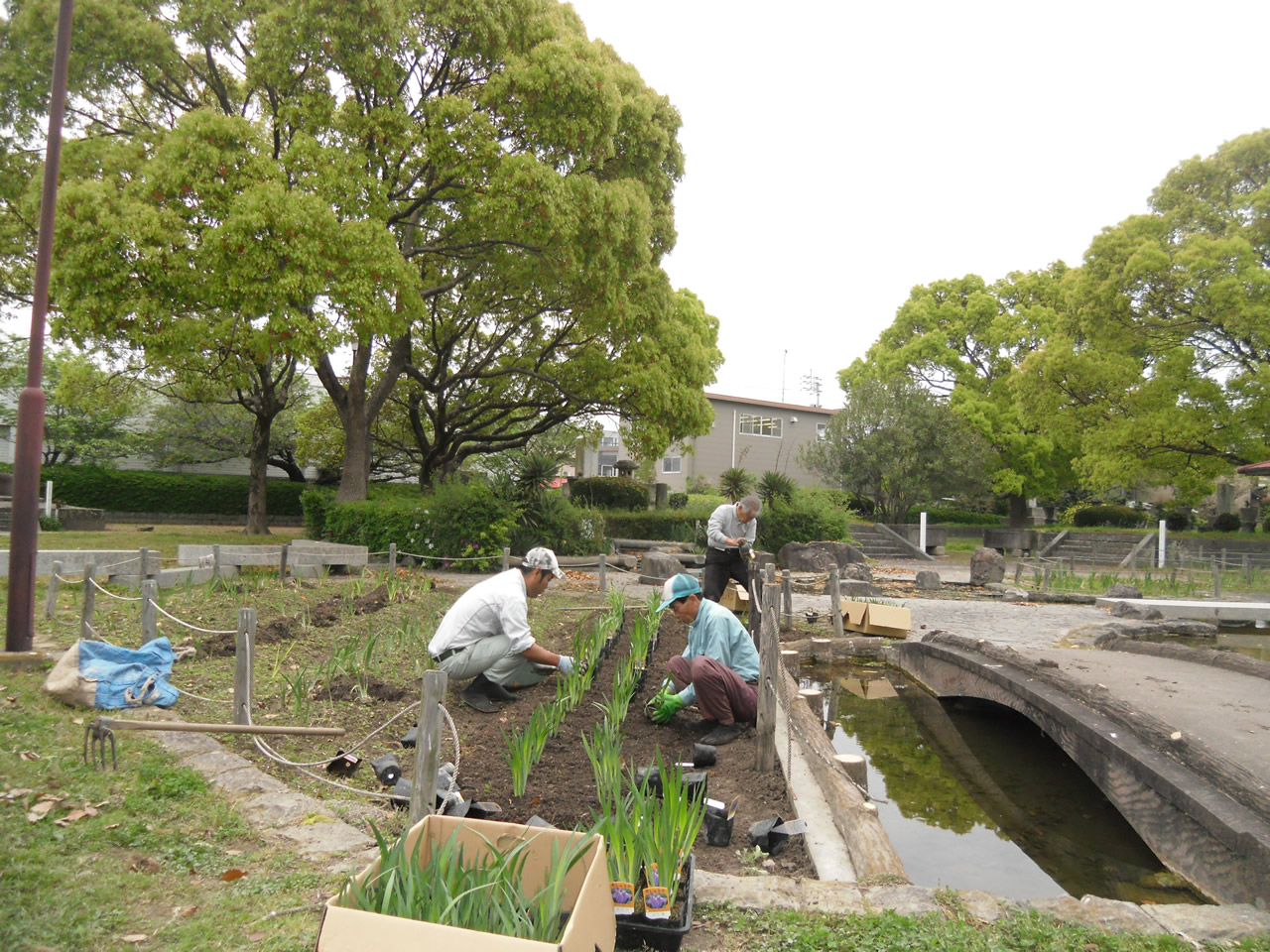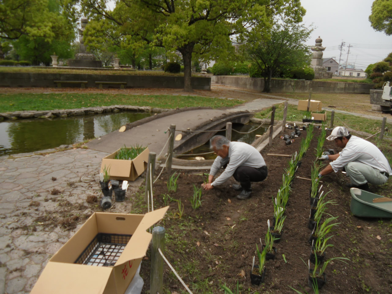 この度、助任緑地のハナショウブ花壇に、「助任緑地を守る会」の西川会長さんと共に、多種類の色のハナショウブ200株を植えました。たくさんの方々に楽しんでいただけたら幸いです。