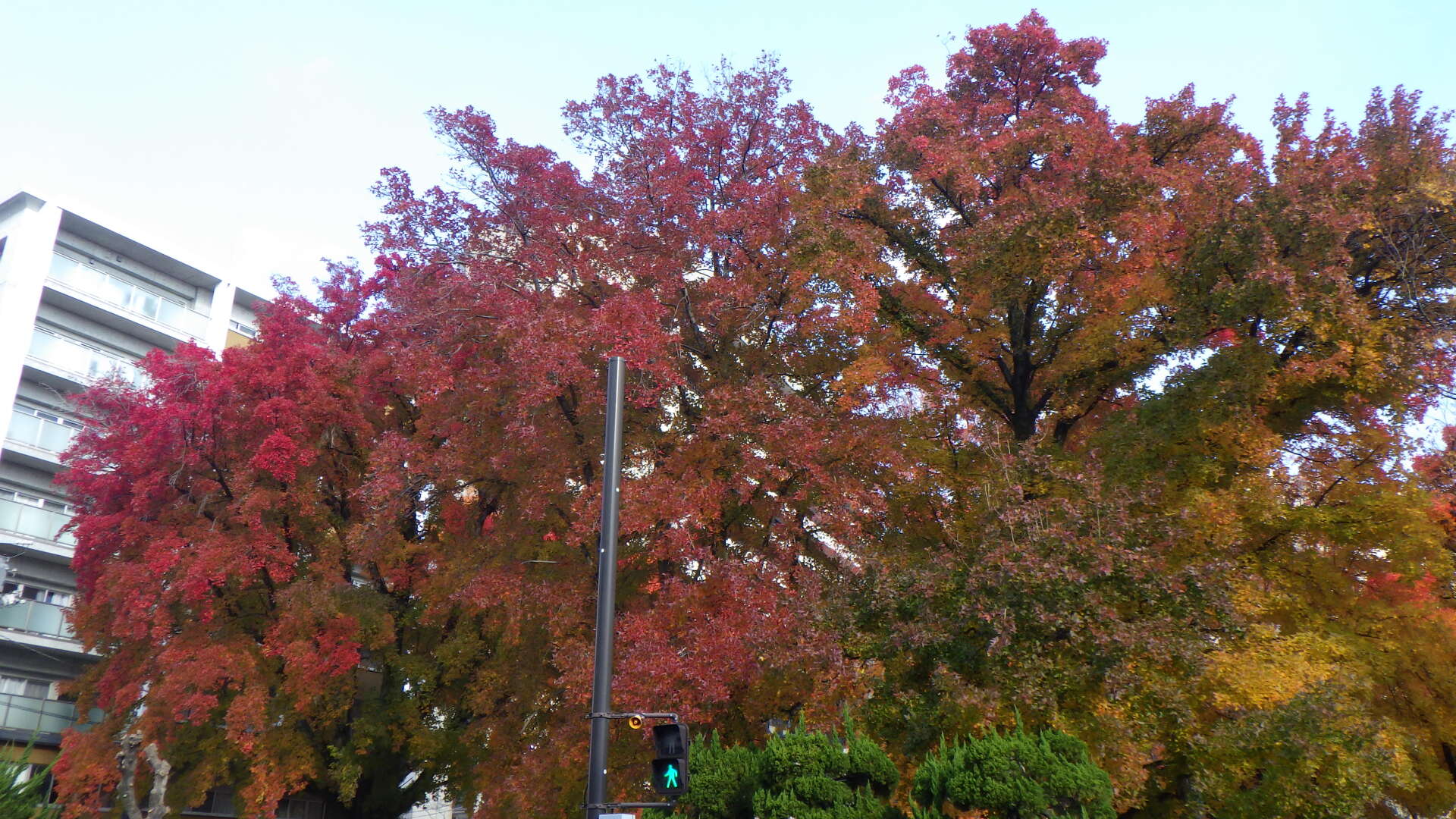 街にもクリスマスソングが響く季節となり、黄色や赤に染まったタイワンフウの葉がとても美しく見頃を迎えています。タイワンフウは台湾に分布する落葉樹で、日本には江戸時代に入り街路樹や公園樹として植えられています。