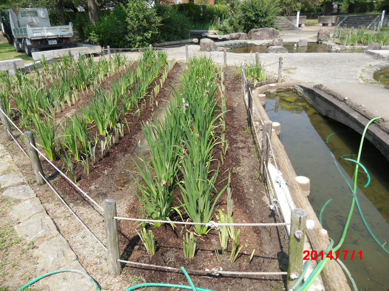 ハナショウブは6月に花を咲かせるため、従来は9月に株分け植え替えをしていましたが、今回、助任緑地において多くの花が咲くよう期待を込めて、花が終わるのと同時に株分け植え替えをしました。「助任緑地を守る会」の西川会長さんと共に多種類の色のハナショウブを植えております。