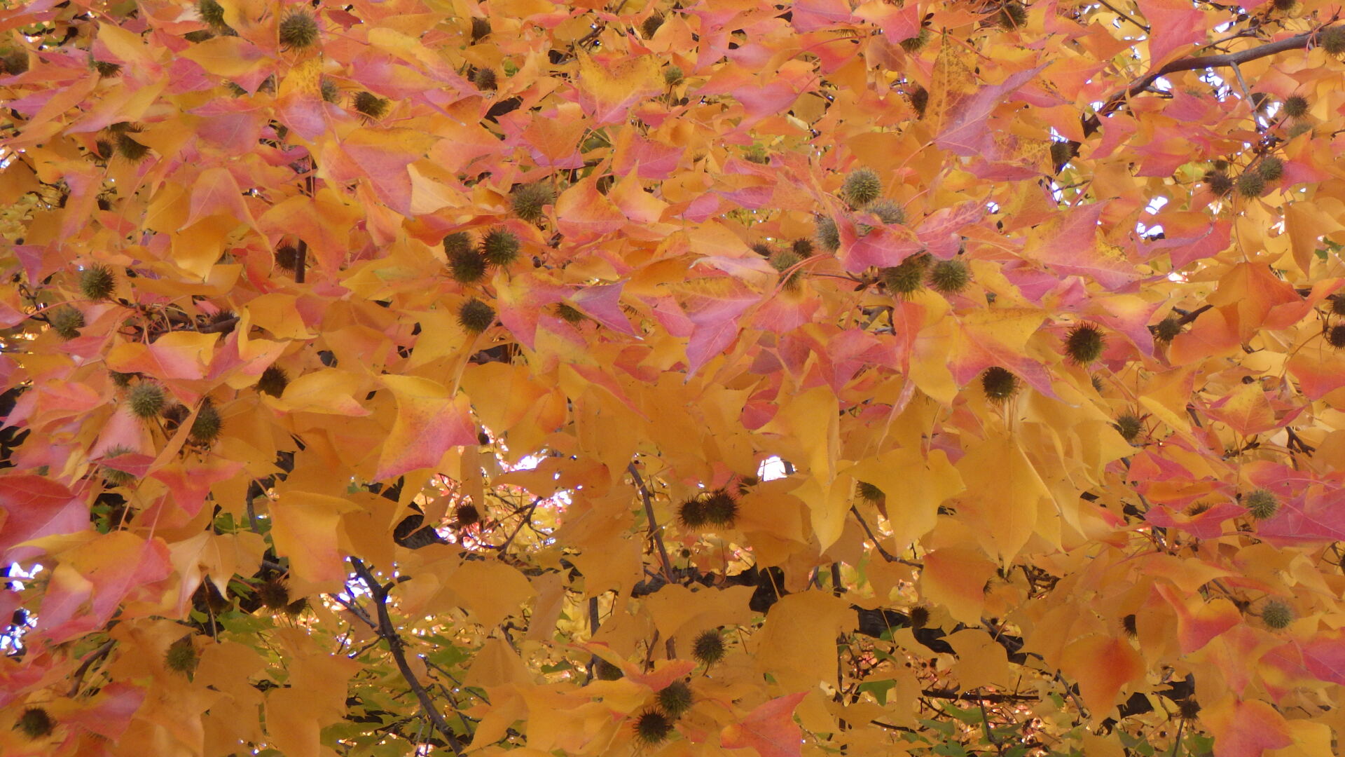 街を歩けばクリスマスソングを耳にするこの頃、公園や街路樹では黄色や赤に染まったタイワンフウの葉色が移り行く様はとても美しいです。タイワンフウは、最も大きいもので20mを超え、葉っぱは浅く三つに裂けています。