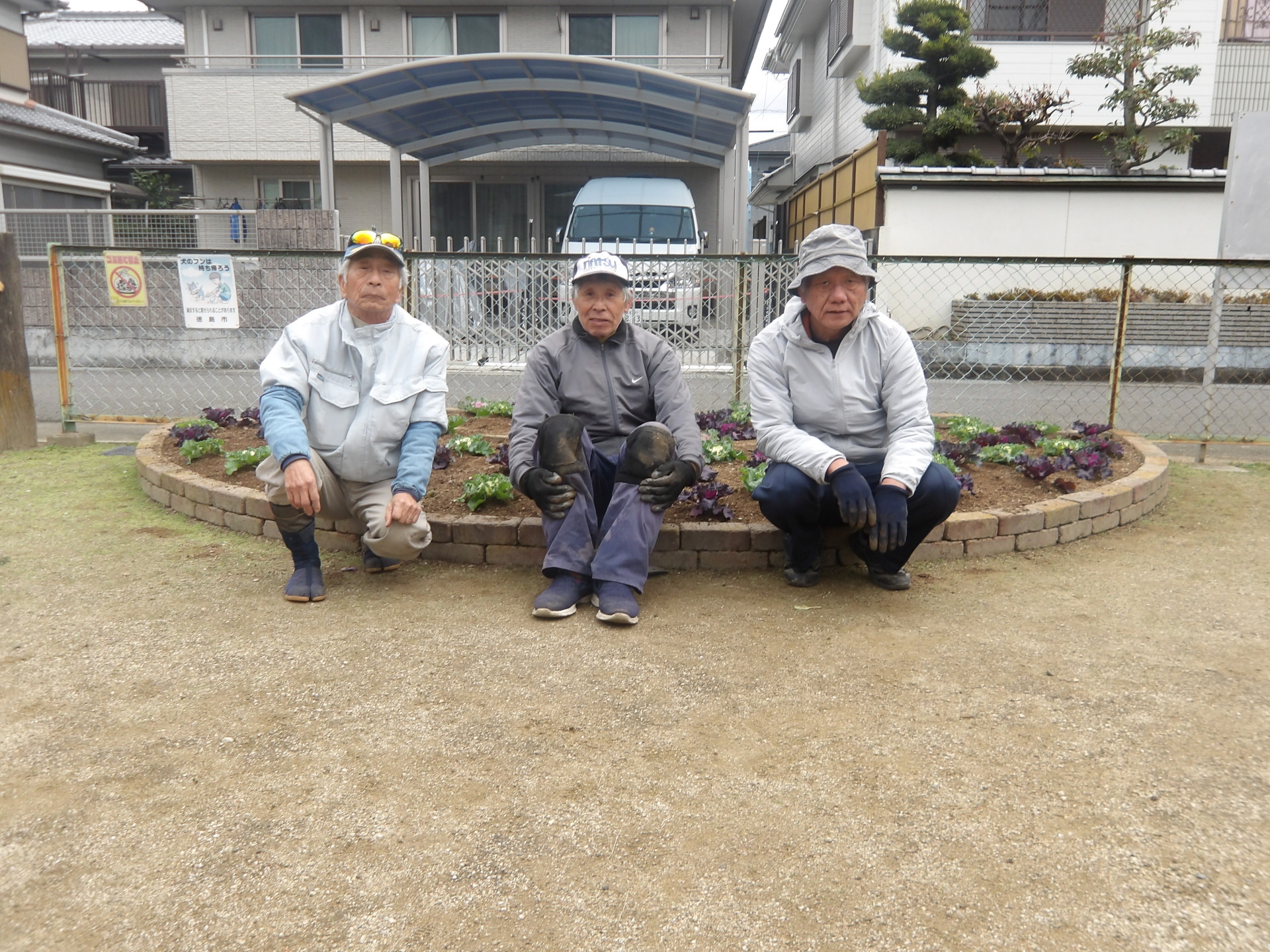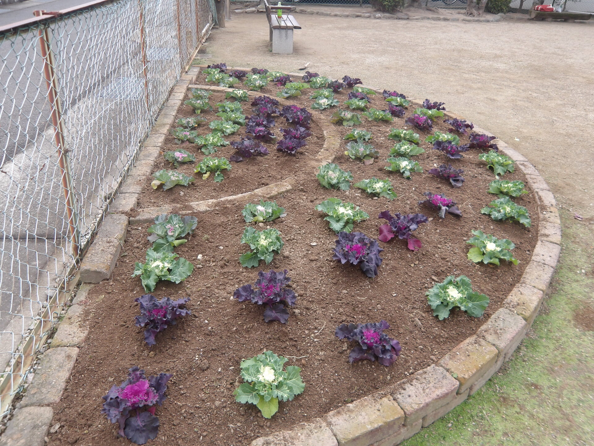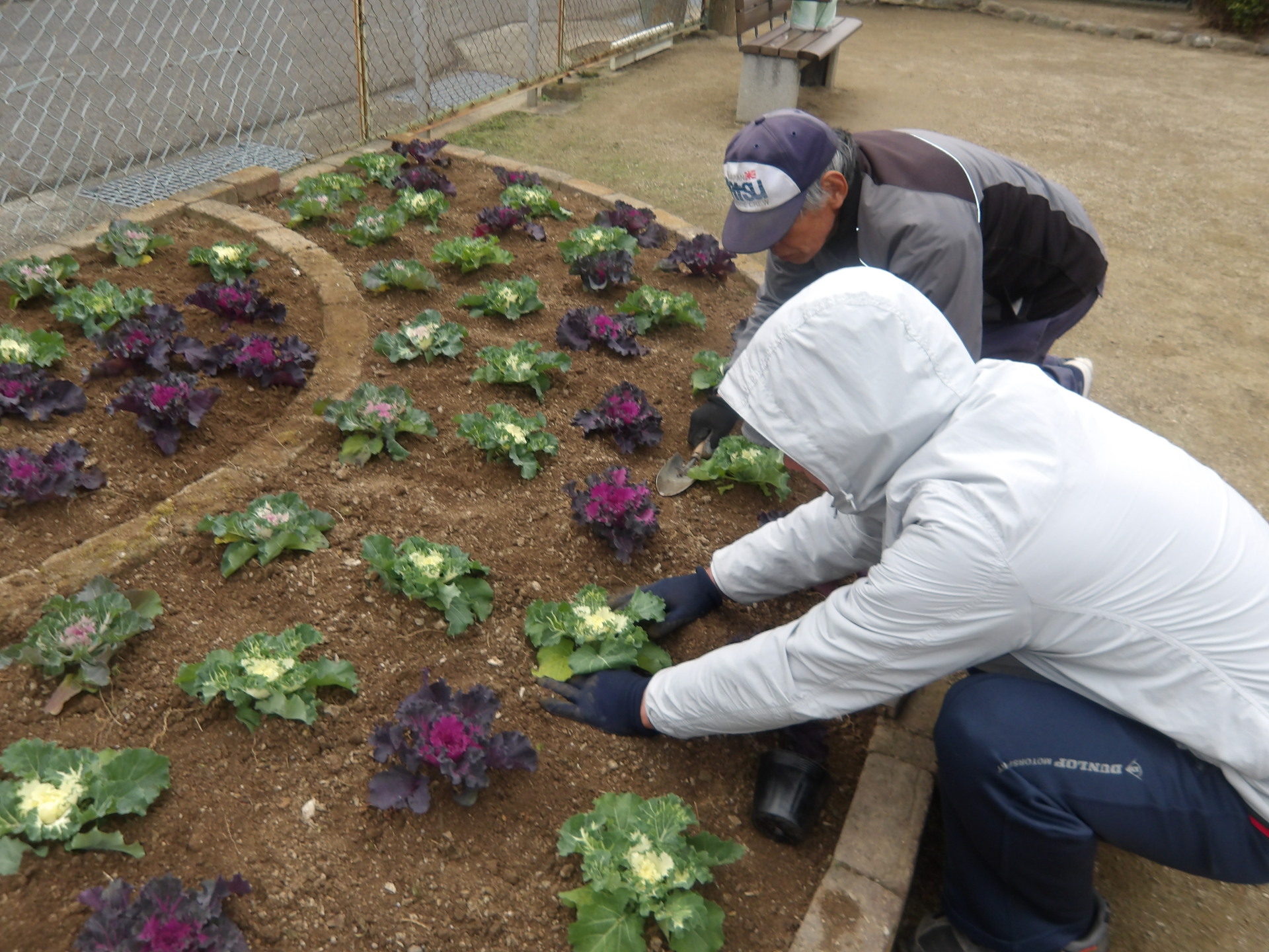 朝ふとんから出るのがつらい季節となりましたが、12月12日(金)「光陽台町内会」の皆様と庄町南公園の花壇の花を葉ボタンに植え替えました。地面からポコポコと咲く葉ボタンは、カラフルなボタンを床に散りばめたような美しさで、お正月飾りに葉ボタンを飾ると縁起が良いと言われています。