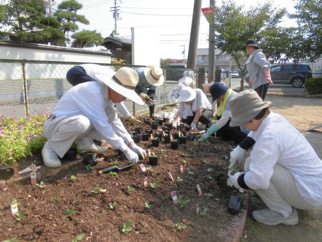 秋の長雨と申しますが、例年になく雨の多い季節となりました。9月11日、庄町南公園で地元の皆さまとともに協働で市民花壇に、秋の花苗を植えました。花の種類は、パンジー60ポット、ビオラ60ポットで合わせて120ポット植えました。今回の花苗は、少し小ぶりでつぼみもなく、多くの花苗から花が咲くように期待を込めて植えております。パンジー、ビオラが多くの花を咲かせ、地元の皆さまに満足していただきたいと考えています。