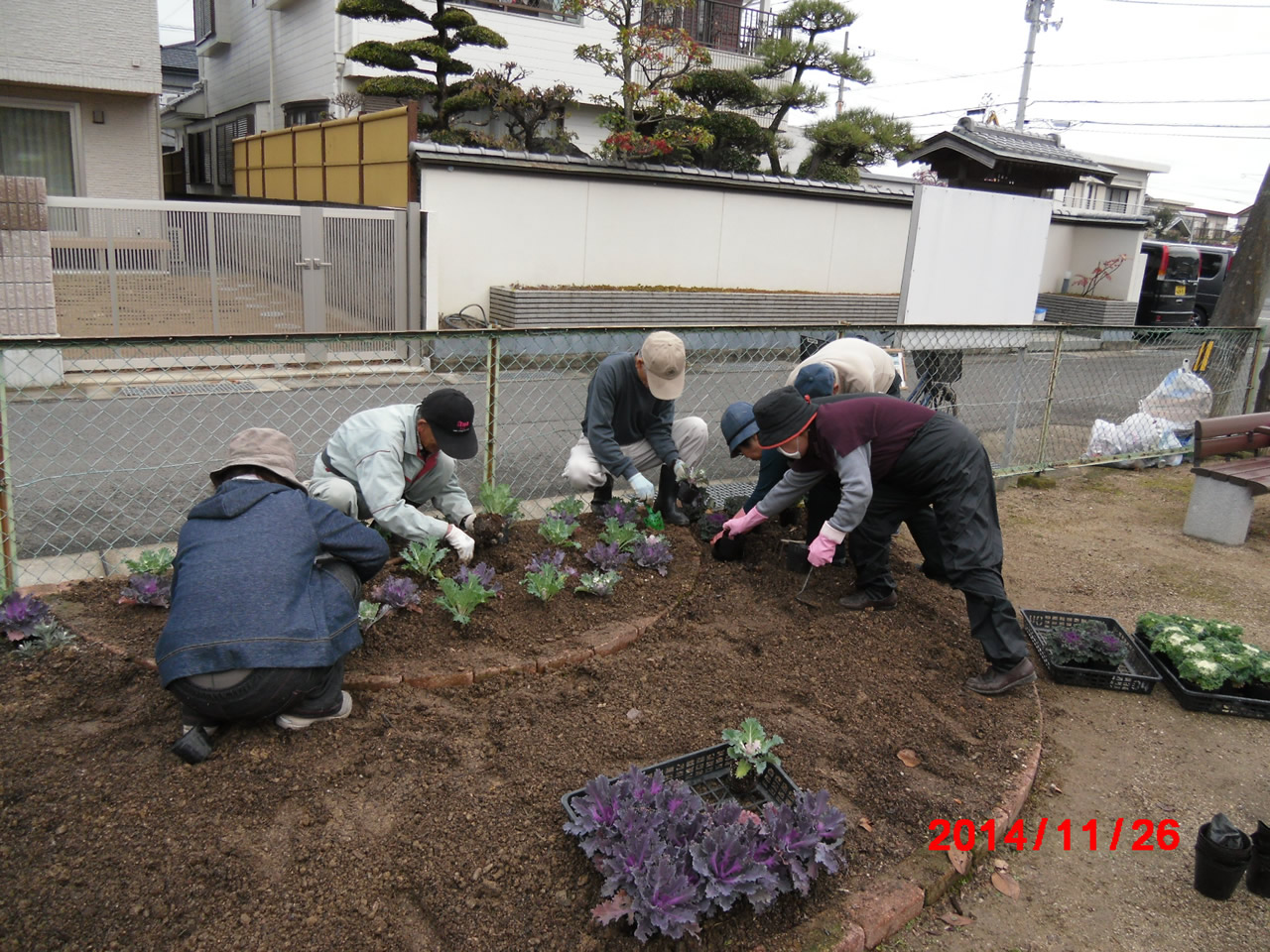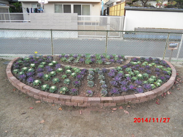 秋の色もようやく深みを増しています。11月26日(水)、庄町南公園において地元の皆様と協働で花壇に、ハボタン紅白合わせて170ポットの花を植えました。2015年の新しい年を迎えるに際し、ハボタンが大きく育つことを期待し、花と花の間隔を十分取って植えております。