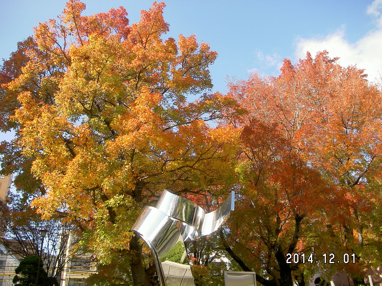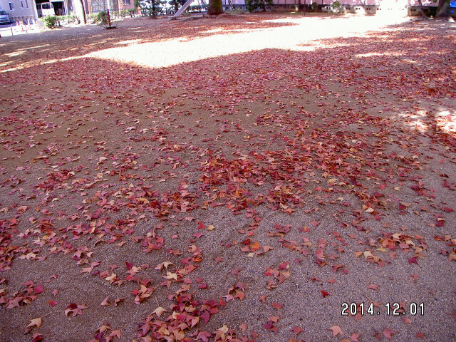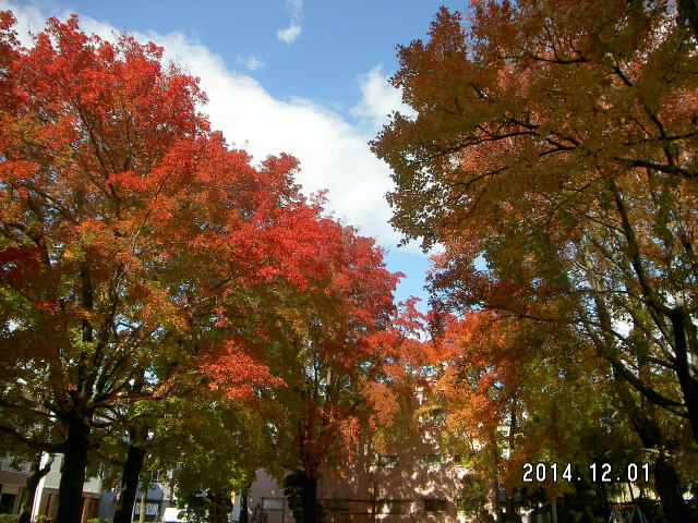 クリスマスのイルミネーションが、目を楽しませてくれる季節となりました。街路樹では、紅葉の役目を終えた枯れ葉が舞い、葉を落としています。紅葉が鮮やかで美しいタイワンフウは主幹が垂直に立ち、円錐形に伸びる樹木です。春には多数の芽吹きが見られ、夏には青々とした葉っぱをたくさん茂らせ、秋には黄色から赤色に変わる紅葉が特に美しい樹木です。冬には地面が落ち葉でいっぱいになり、紅いジュータンが敷き詰められているように見えます。