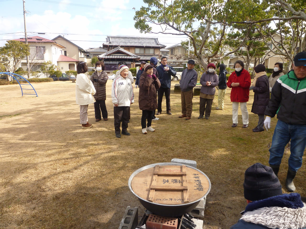 さる2月1日、丈六南公園において防災訓練が実施されました。参加者は約100人にのぼり、本番に即した有意義な訓練となりました。今回の防災訓練では、当公社が寄贈したかまどベンチを利用した、豚汁の調理が実際に行われました。