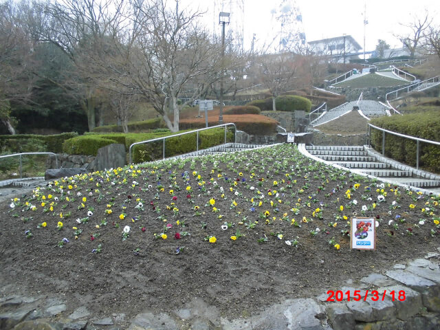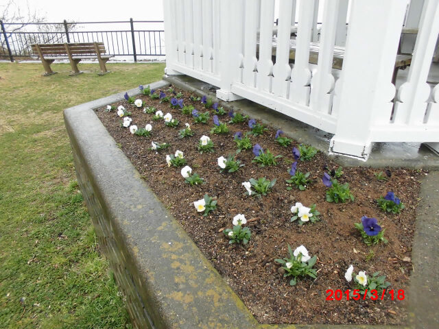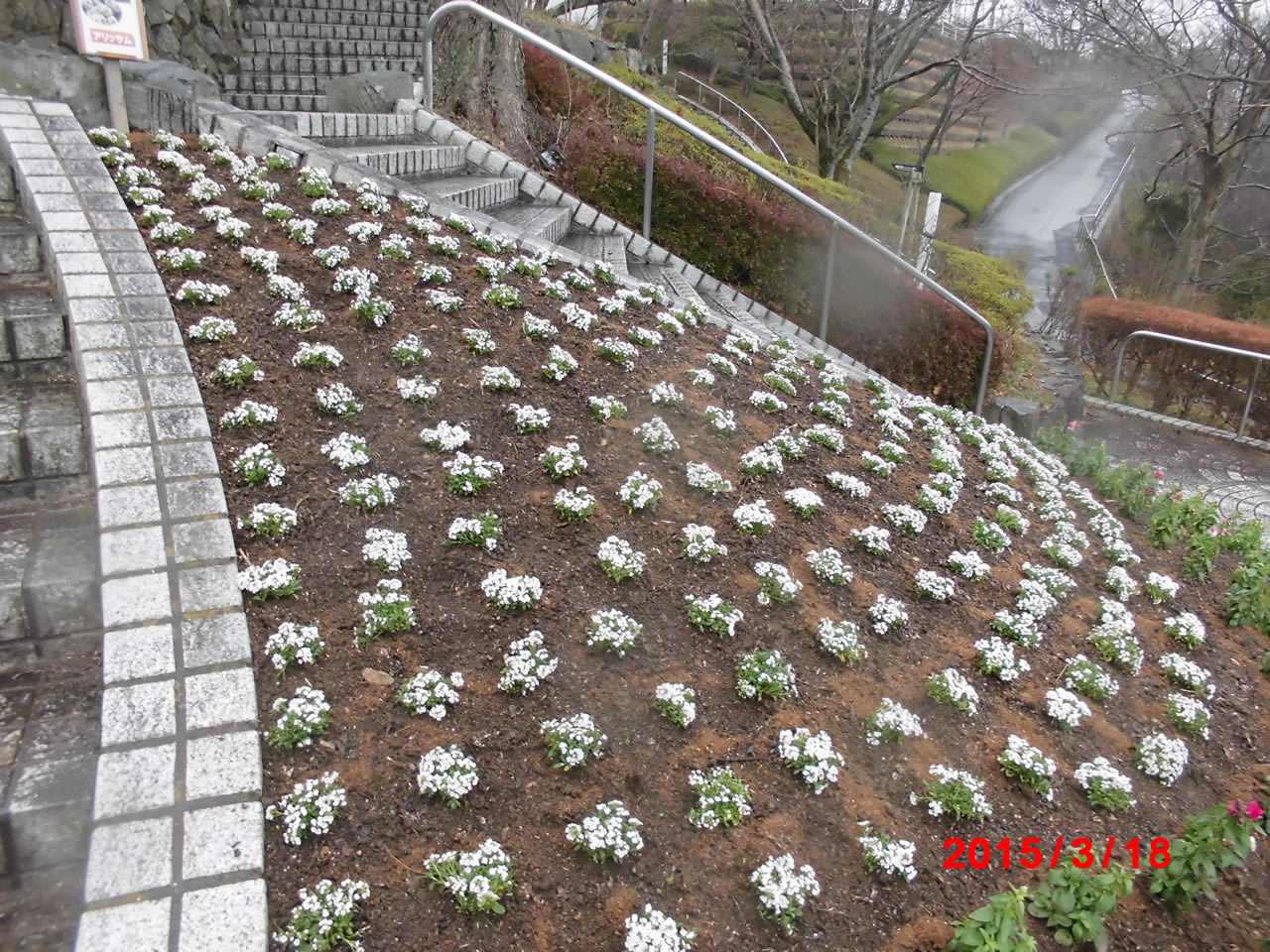 この度、眉山公園において、桜の開花に合わせて花のカスケードとガゼボの花壇に、花を植えました。桜のお花見シーズンに来園された、たくさんの方々に見ていただけたら幸いです。花の種類は、花のカスケードにノースポール、パンジー、ムルチコーレ、アリッサム、キンギョソウの5種類で、見頃の花ばかり2030ポット植えております。また、ガゼボの花壇にはパンジーを90ポット植えております。