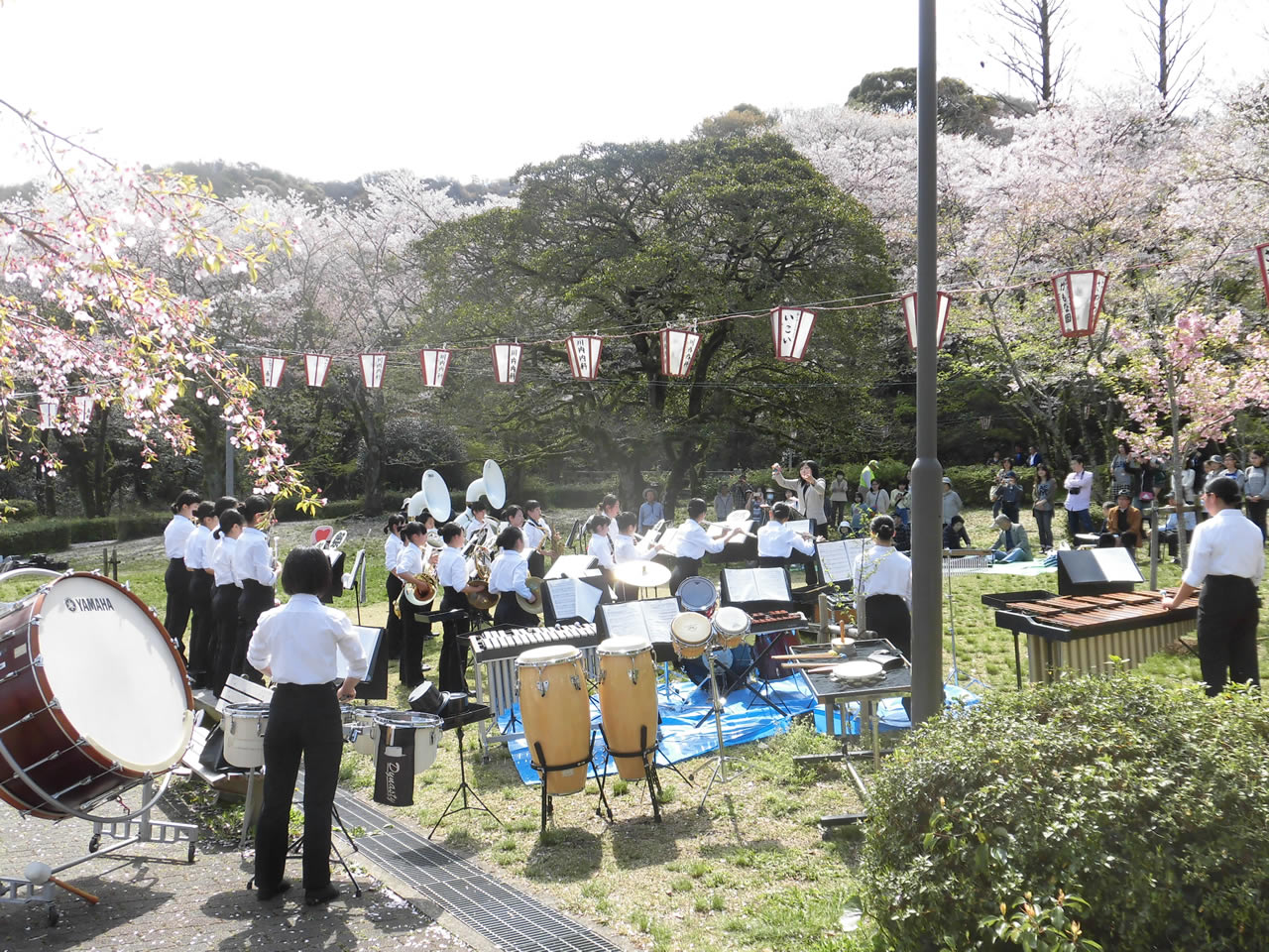 桜の花もらんまんとなり、華やかな季節となりました。「日本のサクラ名所百選」に選ばれている西部公園で4月4日(土)10時30分より、約550本のサクラの下で、加茂名中学校吹奏楽部による「第六回らんまんコンサート」が開催されました。春風で桜吹雪が舞っているなか、吹奏楽部部員20名余りの、素晴らしい演奏に約200人が酔いしれました。