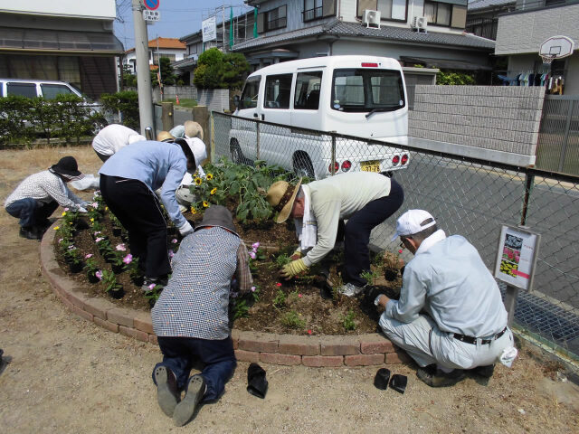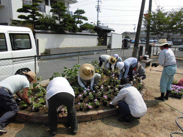 ひまわりが毎日のようにぐんぐんと背を伸ばすこの頃、7月27日(水)庄町南公園内の花壇において、地元の皆様と協働で夏の花に植え替えました。植え替えた花は、サルビア30ポット、マリーゴールド60ポット、トレニア60ポットで、暑さに強い花に植え替えしました。