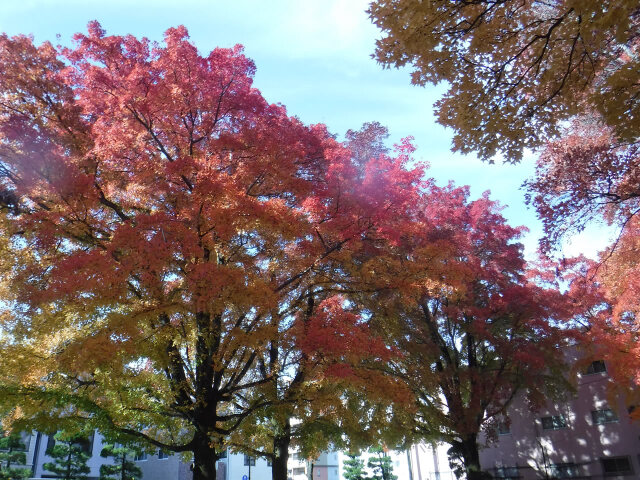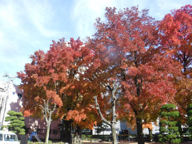 クリスマスイルミネーションが目を楽しませてくれる季節となりました。秋の紅葉で代表的なタイワンフウの葉が美しく彩っています。タイワンフウは、主幹が立ち円錐形に伸びる樹形で紅葉が特に美しく、黄色から紅色になり樹皮は灰褐色で滑らかで落葉後の端整な枝ぶりにも風情があります。徳島市役所西側の幸町公園でも、タイワンフウの葉っぱが黄色から赤色に変化し鮮やかに紅葉しています。