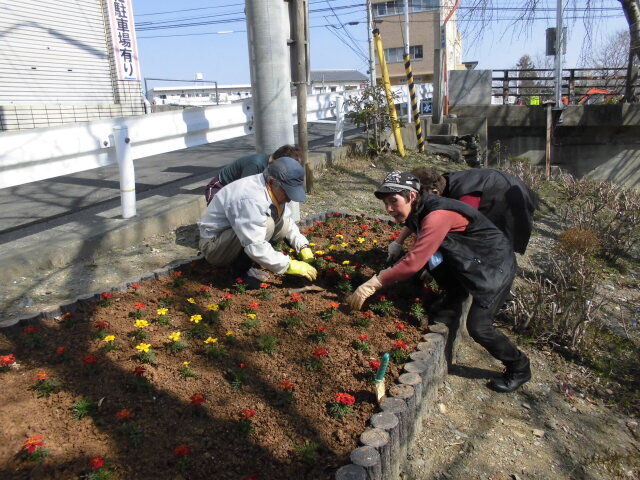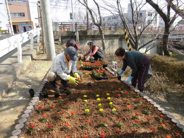 春光うららかな季節を迎え、春花壇に欠かせないマリーゴールドの花200本を、袋井公園を美しくする会の皆様と一緒に植え替えました。