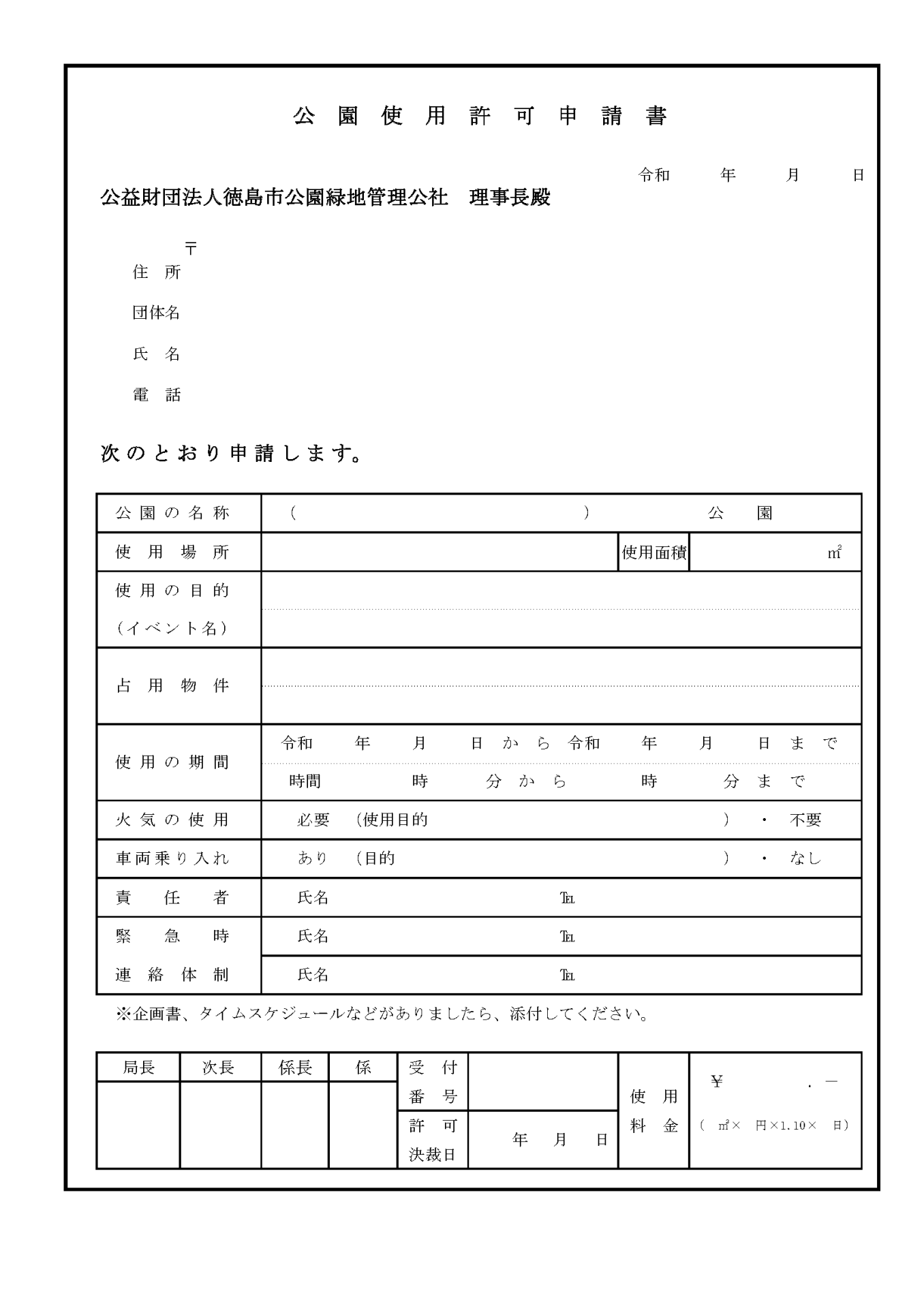 HOME お知らせ 公園使用許可申請書 公園使用許可申請書 2025/04/01 公園使用許可申請書 公園使用許可申請書です。※添付ファイルのPDFは、印刷用にお使いください。 添付ファイル 公園使用許可申請書(PDF) (29kB) BACK HOME