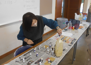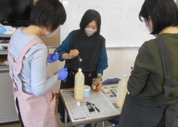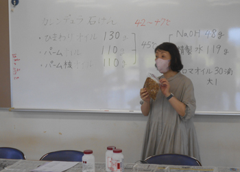 注記:せっけんの販売、配布等を行うには、薬事法などの規制があります。教室で作ったせっけんは、個人利用の範囲内でお使いください。