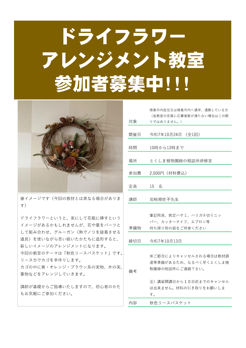 ドライフラワーアレンジメント教室 の参加者を追加募集します。 |
