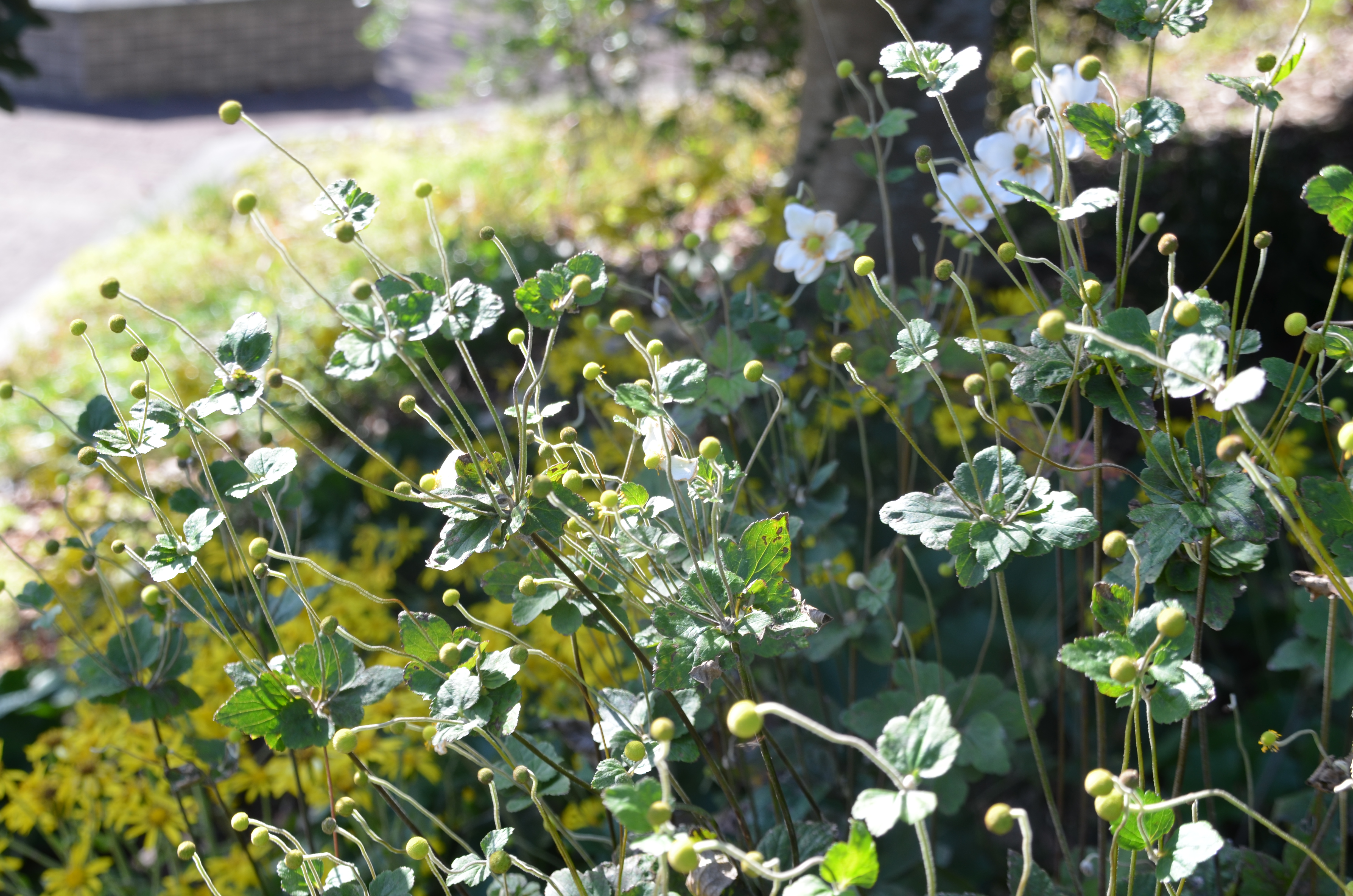 シュウメイギクとツワブキと皇帝ダリアの花。 |