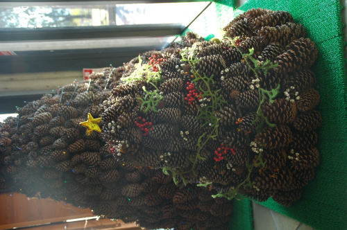 緑の相談所内に展示中の「松ぼっくりツリー」にLEDイルミネーションライトを付けました。そして!その隣にクリスマスの飾り付けをした「小さな松ぼっくりツリー」を作りました。