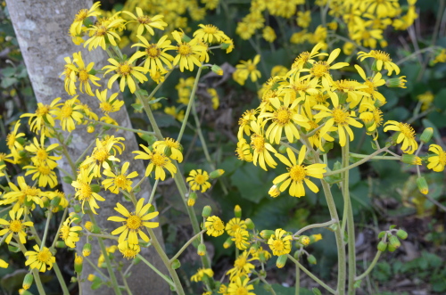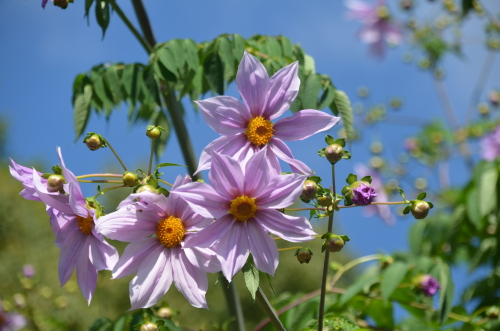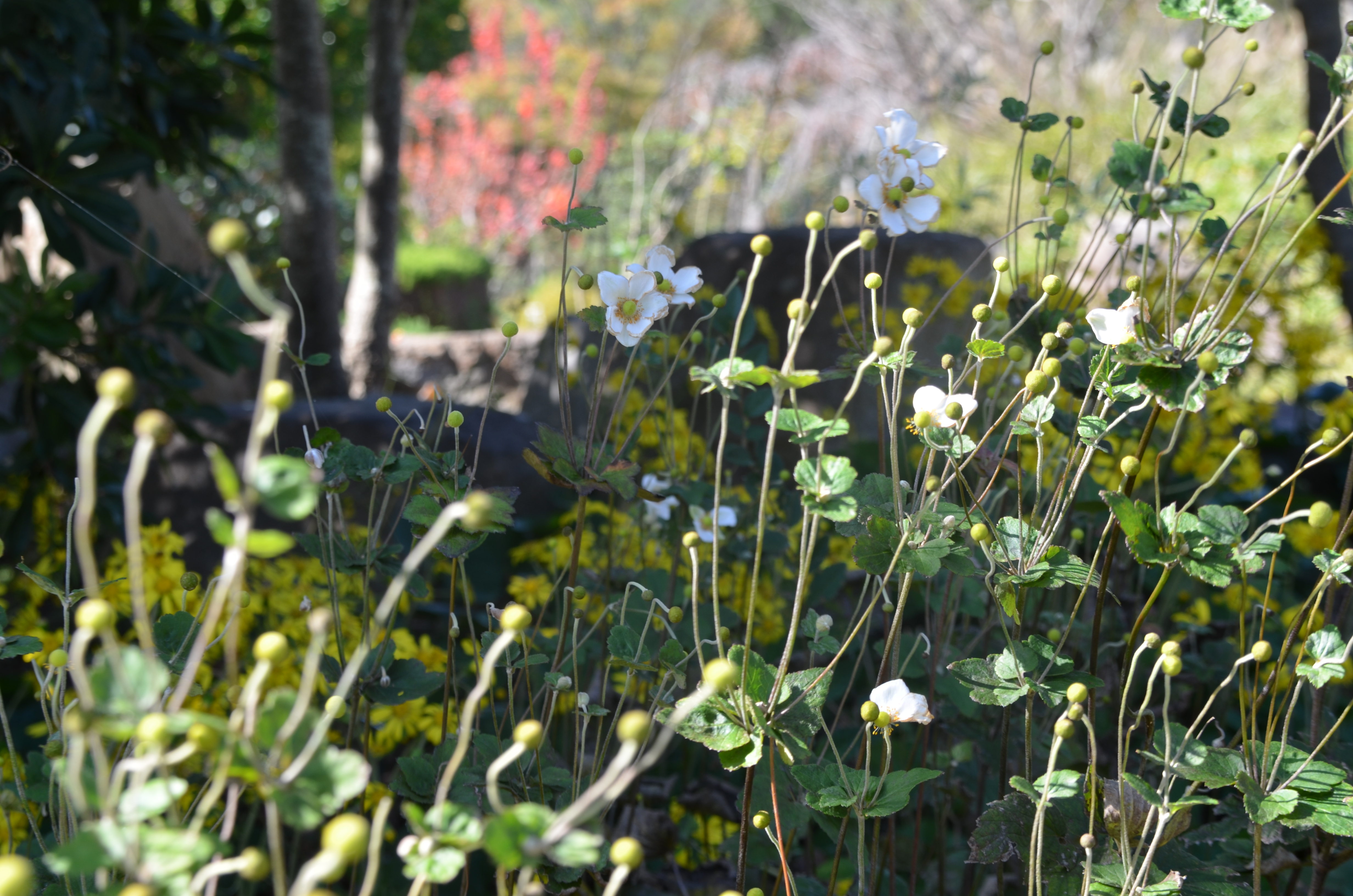 シュウメイギクとツワブキと皇帝ダリアの花。秋の花がたくさん咲いています。