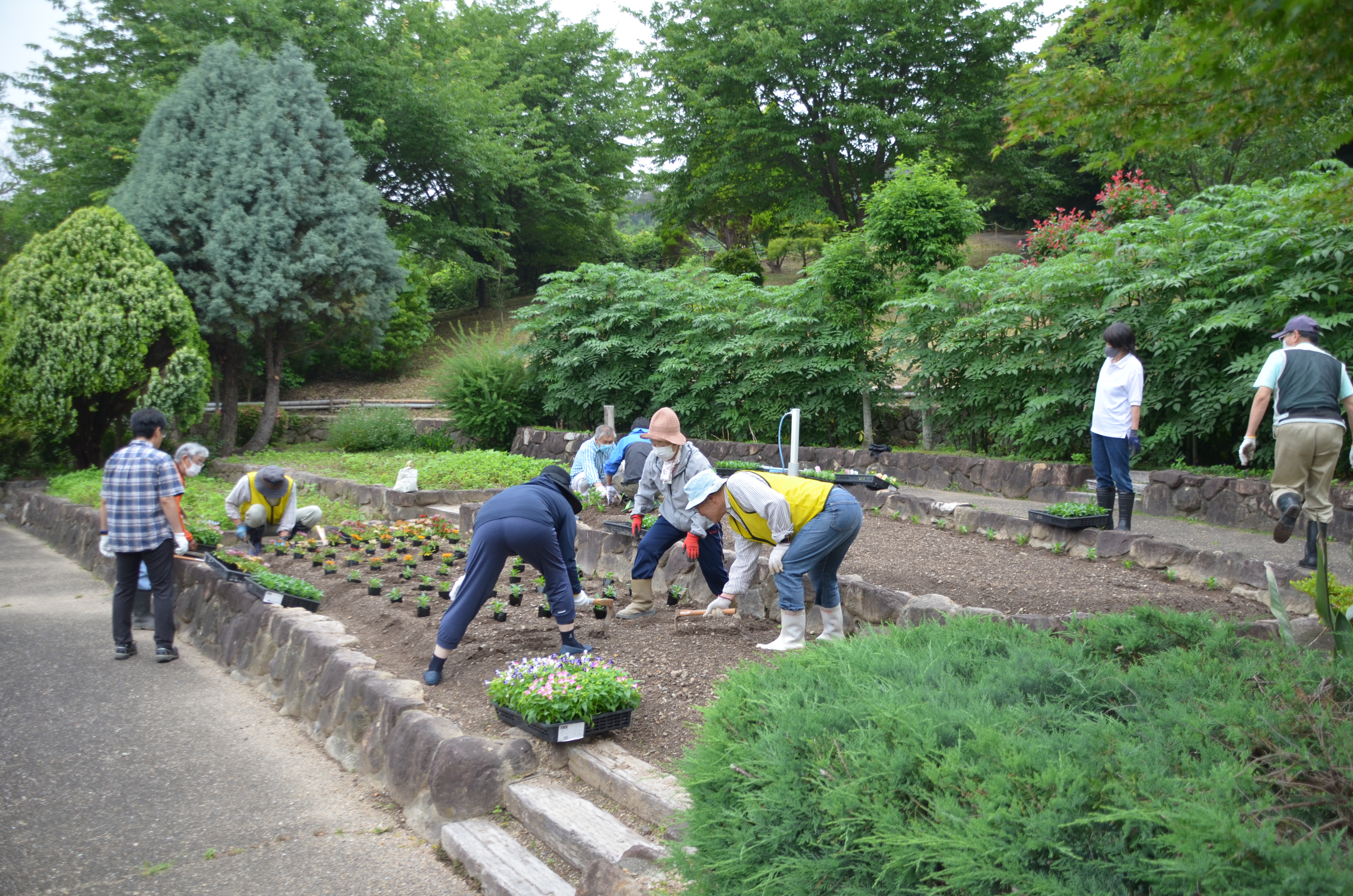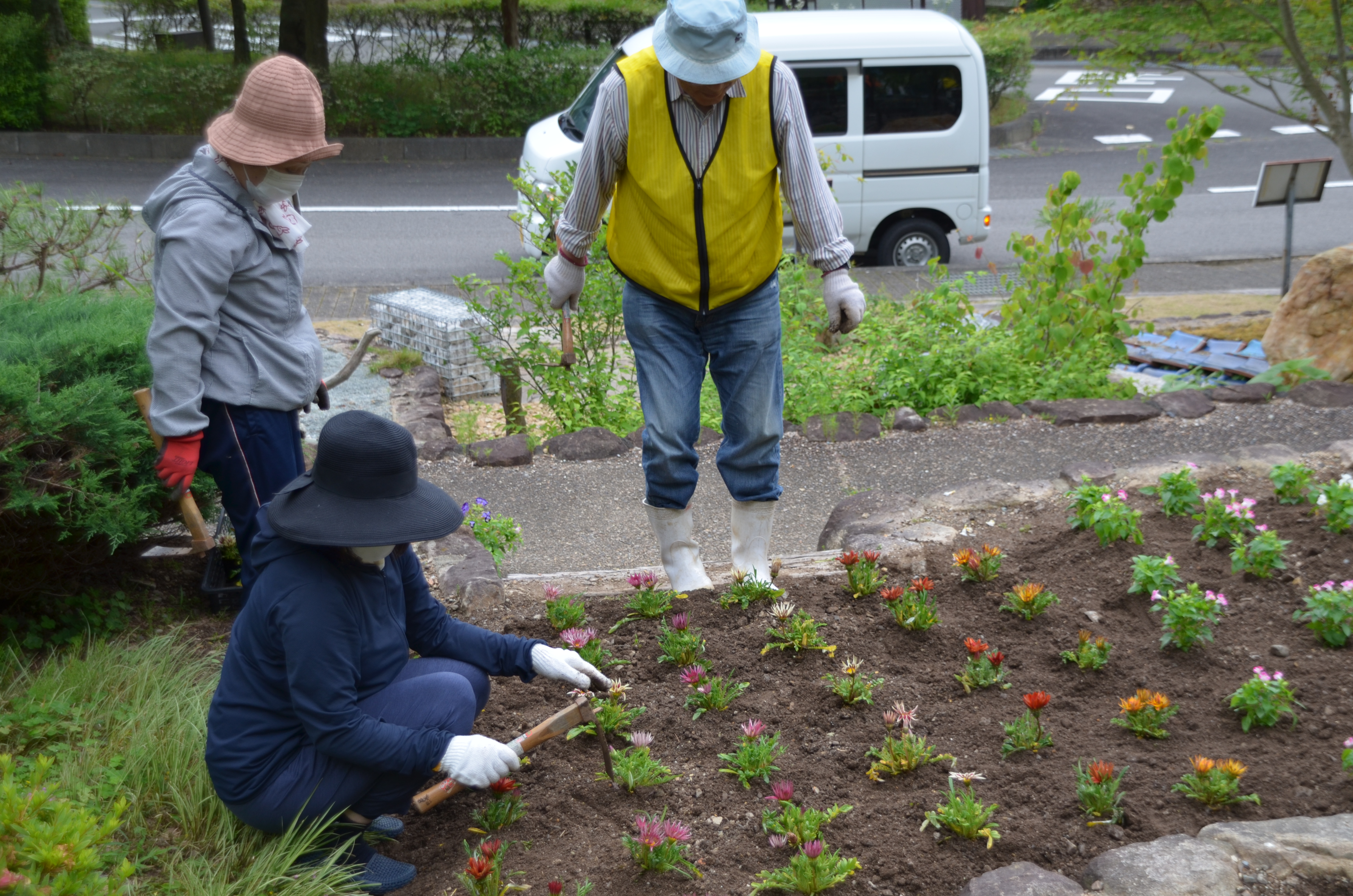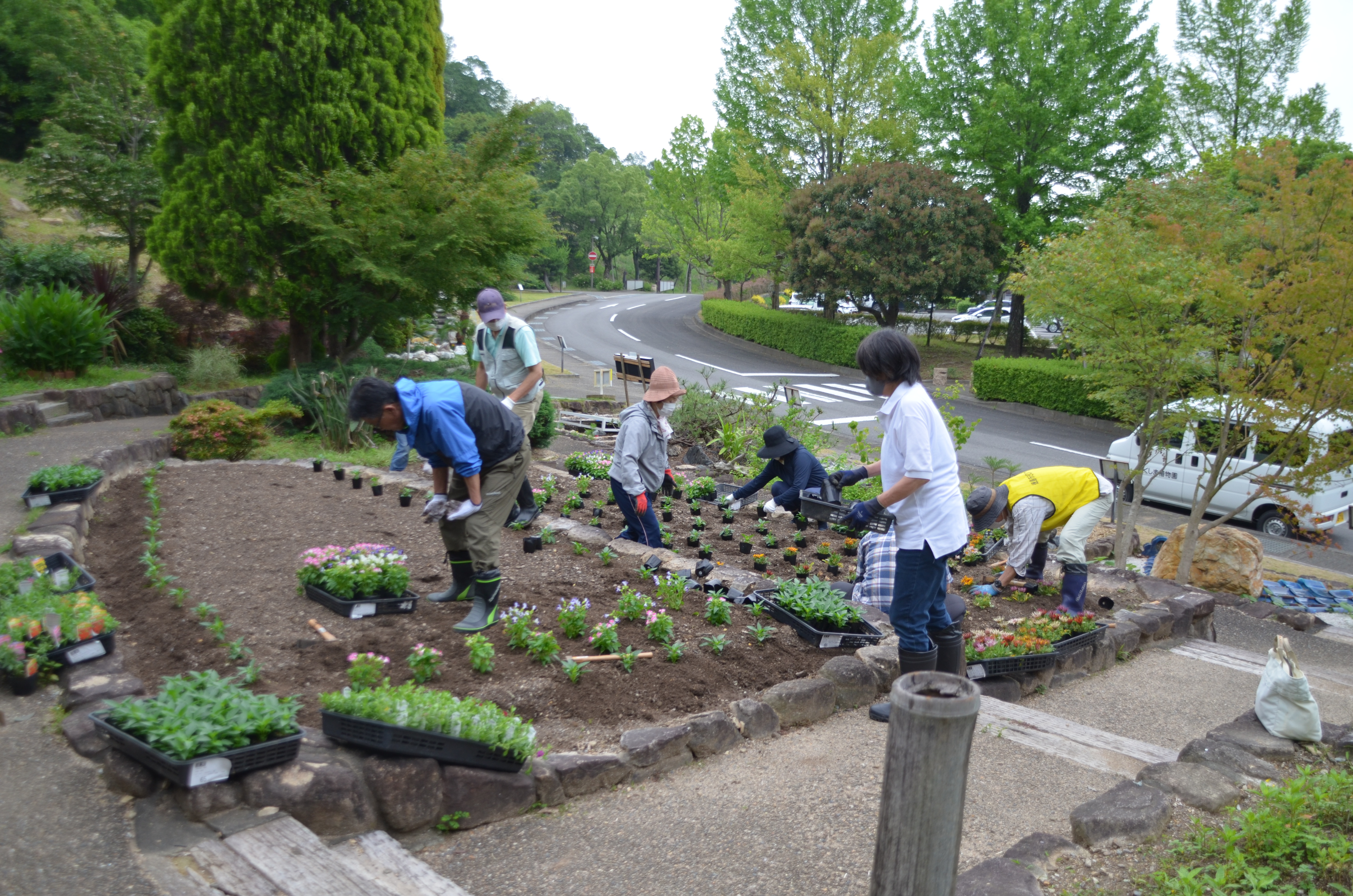 6月10日土曜日、とくしま植物園サポーターにお手伝いいただき、体験花壇にガザニア・トレニア・カリブラコア・観賞用トウガラシを植えました。また、緑の相談所前に展示するハンギングバスケットの制作も行いました。