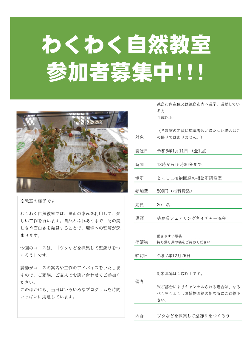 わくわく自然教室 の参加者を追加募集します。お申し込みは電話で。とくしま植物園(088-636-3131)まで。先着順となりますのでお早めにお申し込みください!
