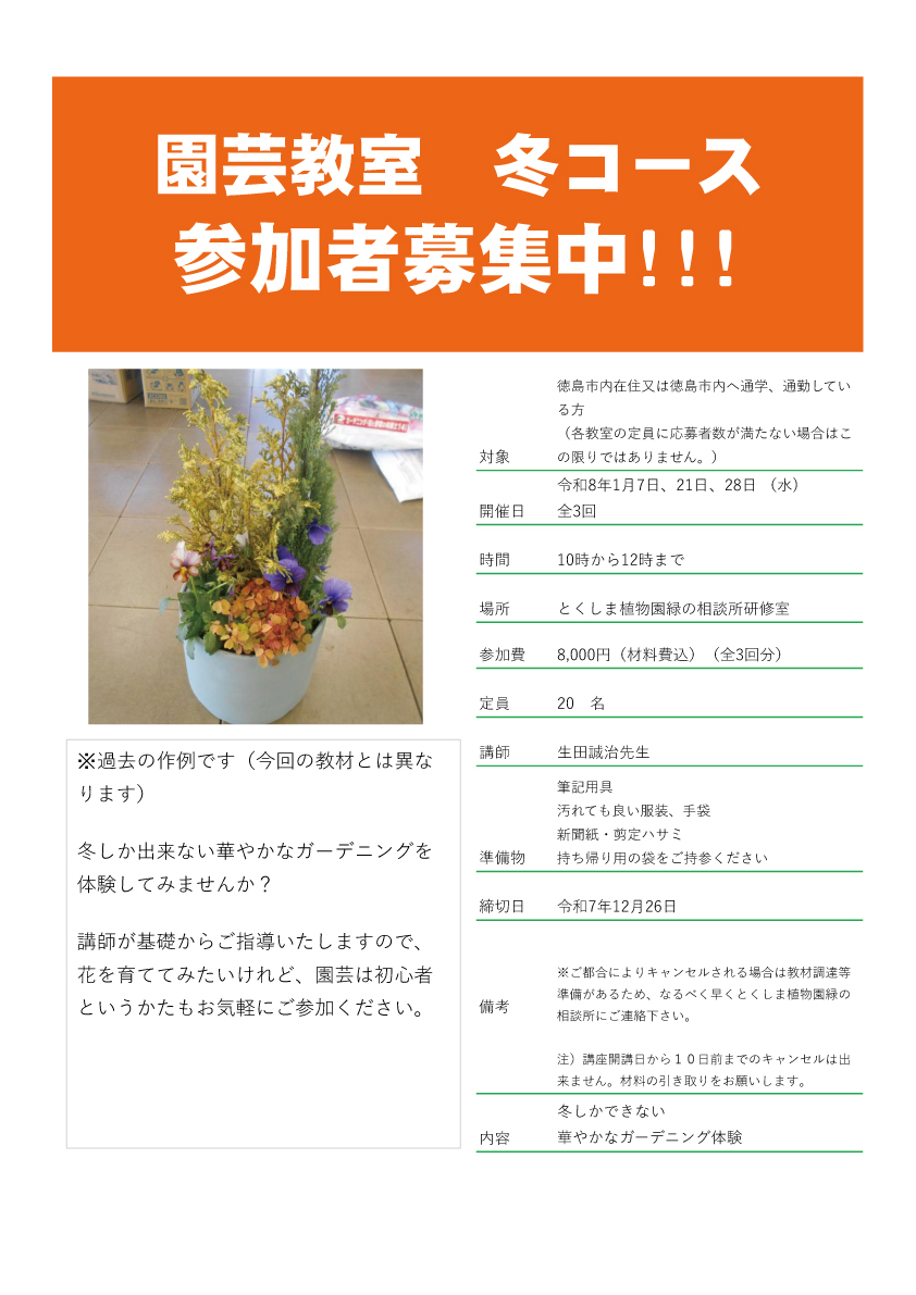 園芸教室冬コース の参加者を追加募集します。お申し込みは電話で。とくしま植物園(088-636-3131)まで。先着順となりますのでお早めにお申し込みください!