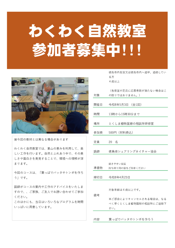 わくわく自然教室 の参加者を追加募集します。お申し込みは電話で。とくしま植物園(088-636-3131)まで。先着順となりますのでお早めにお申し込みください!